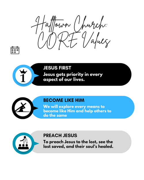 Our core values are to keep Jesus First, to become like him and to preach Jesus. We strive to give Jesus priority, allow him to be the center of our lives and to preach Jesus to the lost. We are working to see the lost saved and the broken healed, just as Christ commanded us to do!